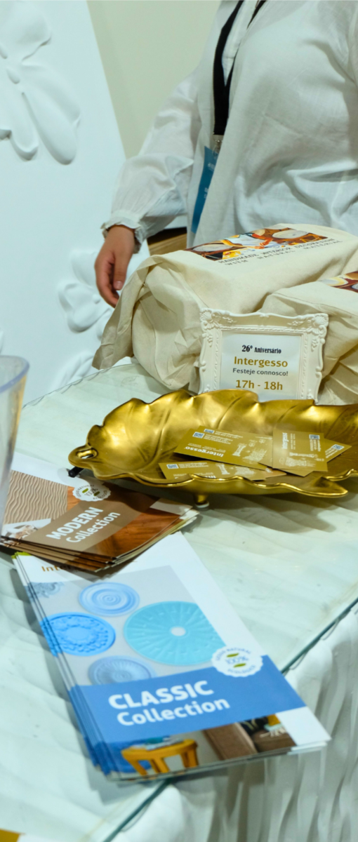 Among the novelties, the ZB001 and ZB002 pilasters stood out, as well as our mastery in replicas such as the symbol of the Order of Pharmacists and the tuberous dome, recreated as a table. The Lounge area, designed by Arch. Joana Marcelino, also featured standard Intergesso pieces.