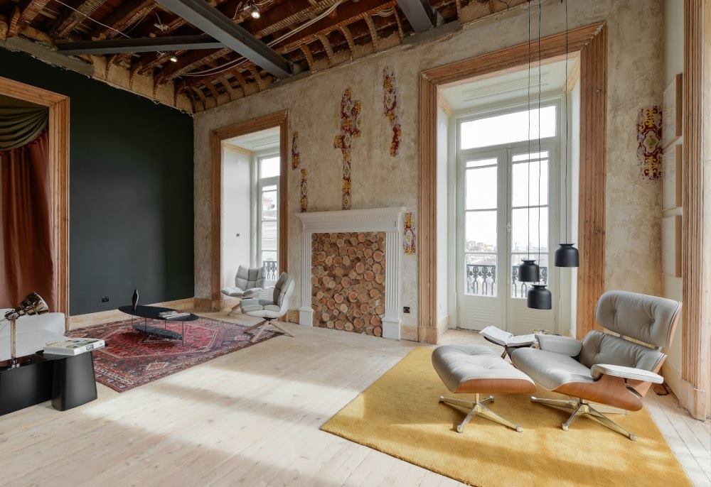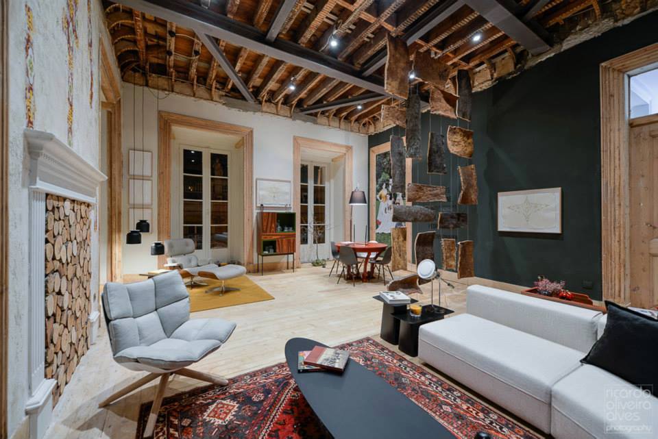 Decoração de lareira com composição de peças em gesso natural, numa parceria com o atelier Spaceroom que exibia aqui a sua capacidade em conjugar peças próprias com a produção externa de especialistas do seu ramo, como é o caso da Intergesso.