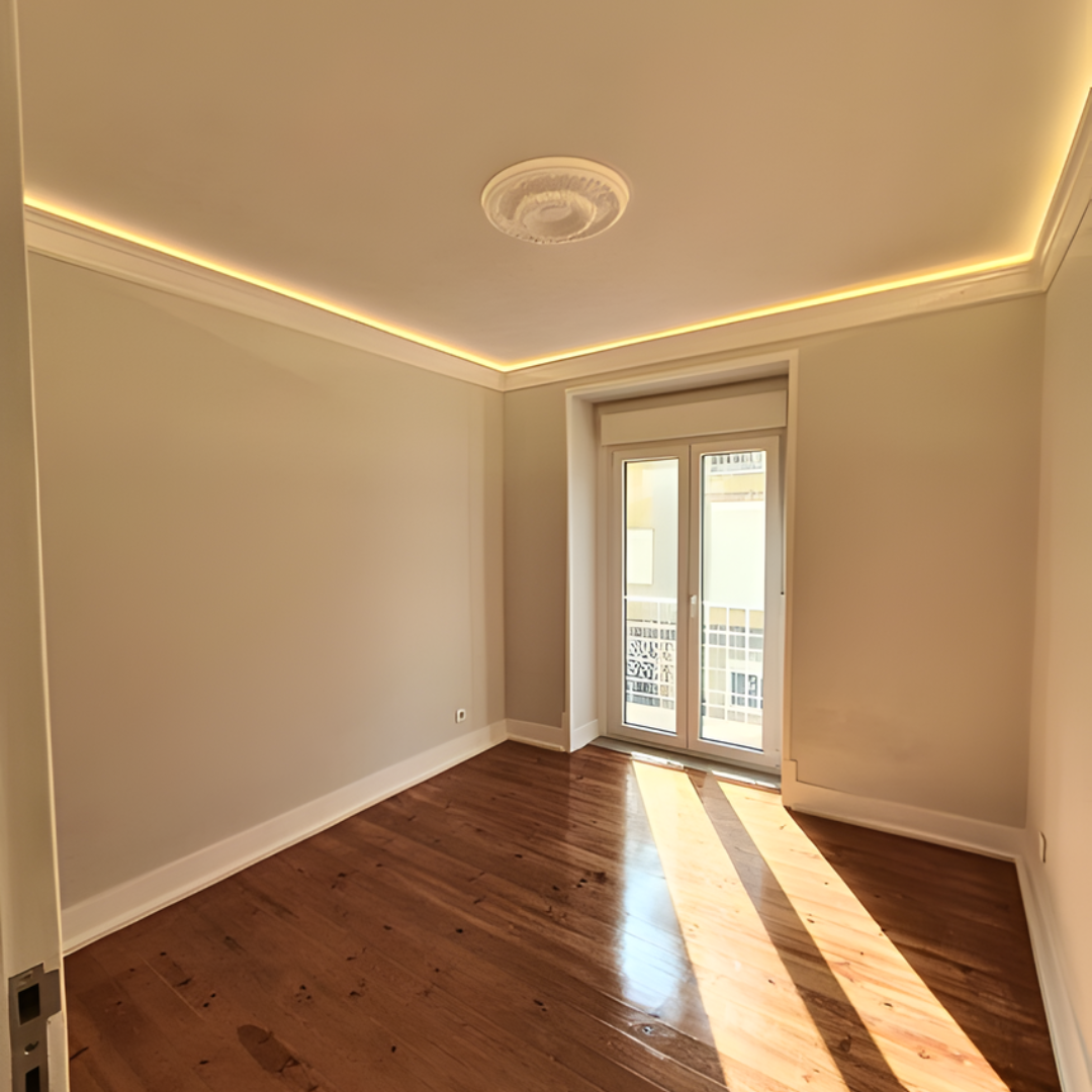 No interior, os frisos standard enquadram e moldam as aberturas, reforçando a elegância das molduras e contribuindo para uma leitura mais sofisticada dos espaços. A sua integração foi pensada de forma cuidadosa, garantindo coerência com a arquitetura existente e continuidade visual entre os diferentes ambientes.